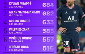 leyu部门-17-18赛季以来五大联赛成功过人榜:梅西826次居首,姆巴佩次席